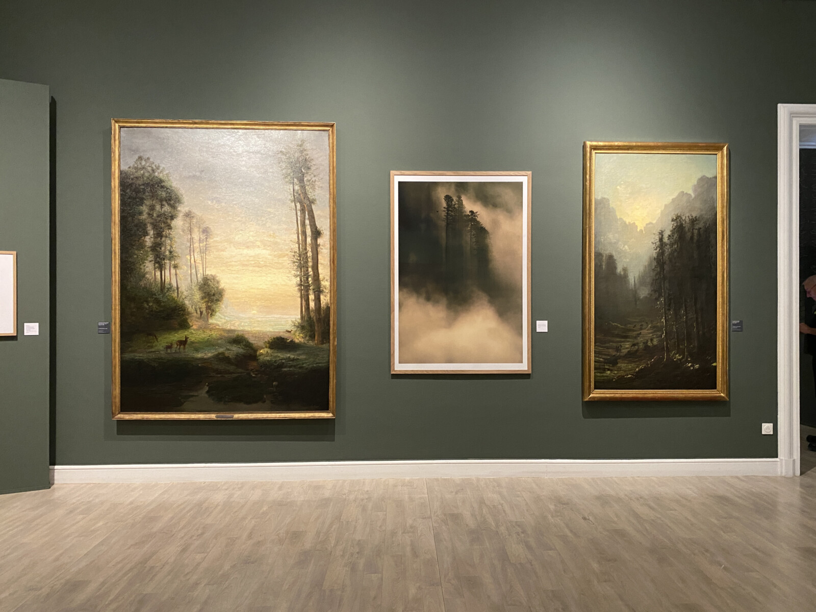 L’exposition tisse un dialogue entre peinture et photographie, naviguant dans la mémoire du paysage et de sa perception contemporaine. Le photographe Vincent Munier, connu pour son approche singulière et respectueuse de l’animal, confronte 81 clichés photographiques, dont une série de cyanotypes