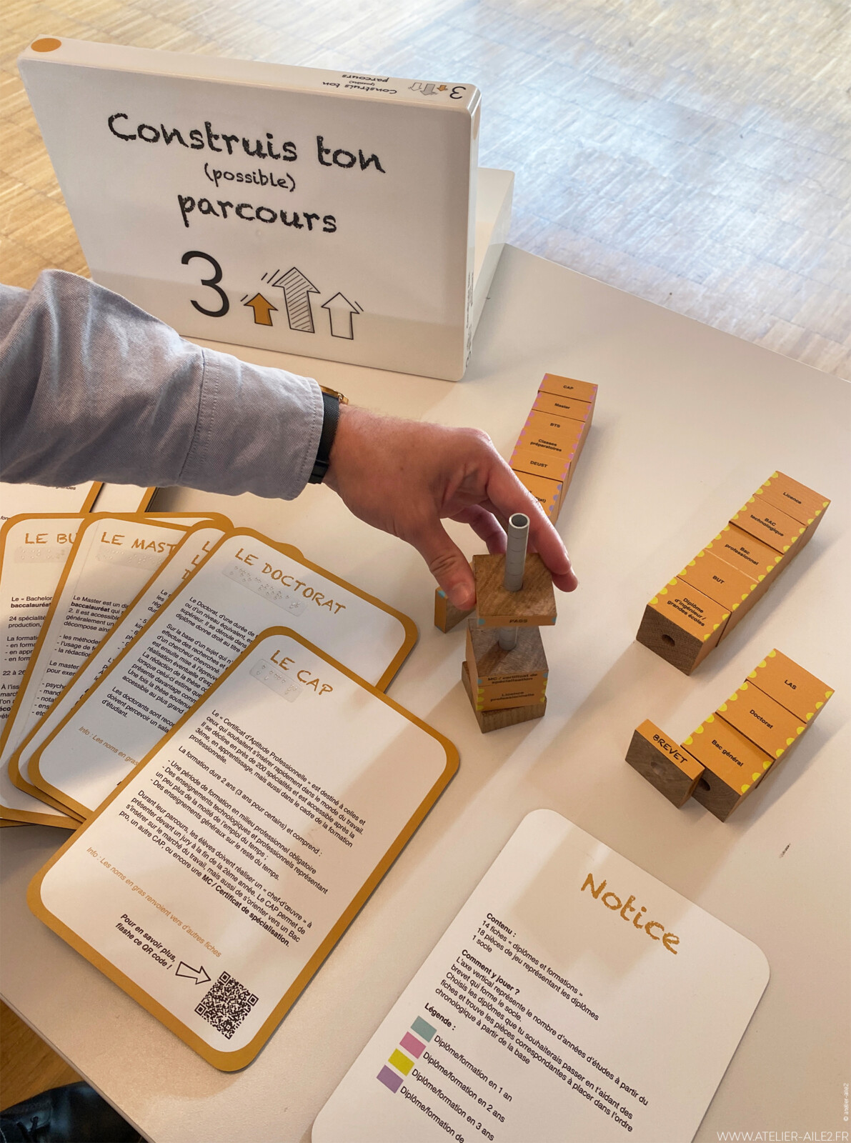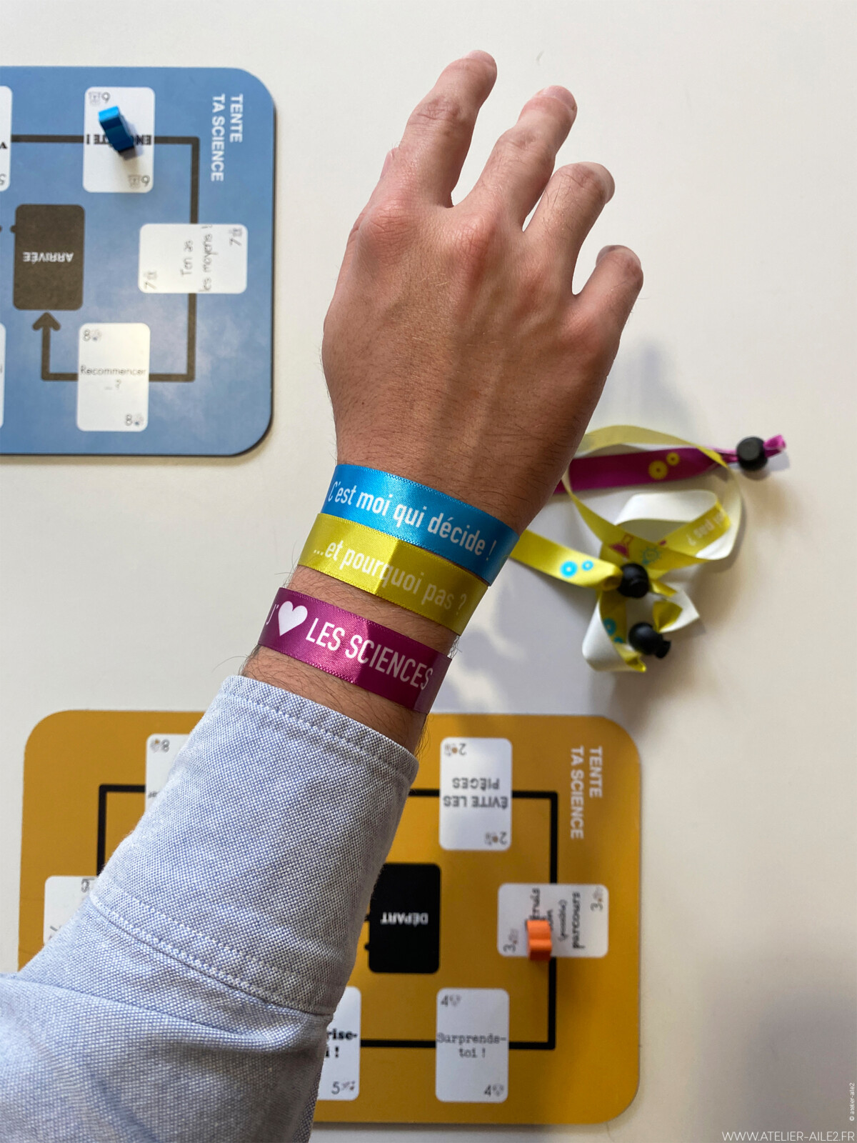 Différents jeux permettent aux élèves de se questionner sur leurs passions, compétences et envies pour leur futur parcours professionnel. Un livret pédagogique, de multiples informations ressources ainsi qu’un bracelet coloré à l’effigie de l’exposition leur sont distribués.