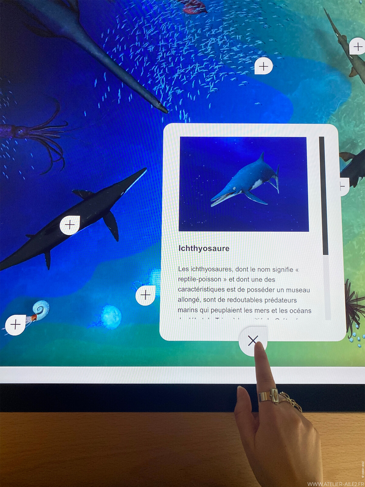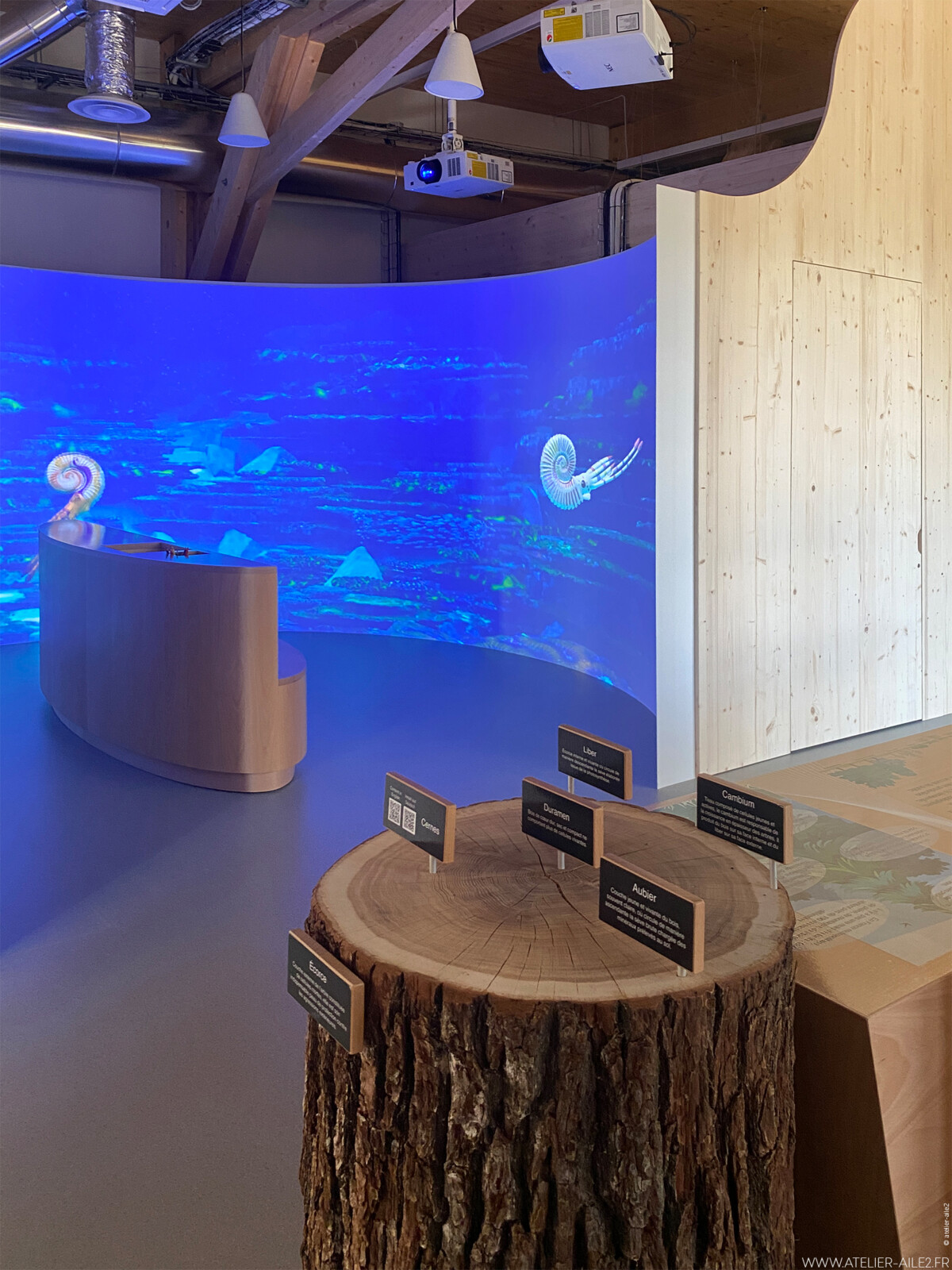 Une salle immersive permet de découvrir le vivant d’une manière nouvelle. Deux immersions sont proposées pour plonger les visiteurs dans le monde marin de la région à l’aire hettangien. Le premier espace permet au visiteur d’interagir en y intégrant ses coloriages d’ammonites. Le second est une salle immersive qui permet au visiteur de guider les décors en approchant des murs, en marchant, … La fin de la séquence se termine avec le vol sur dos de dinosaures.